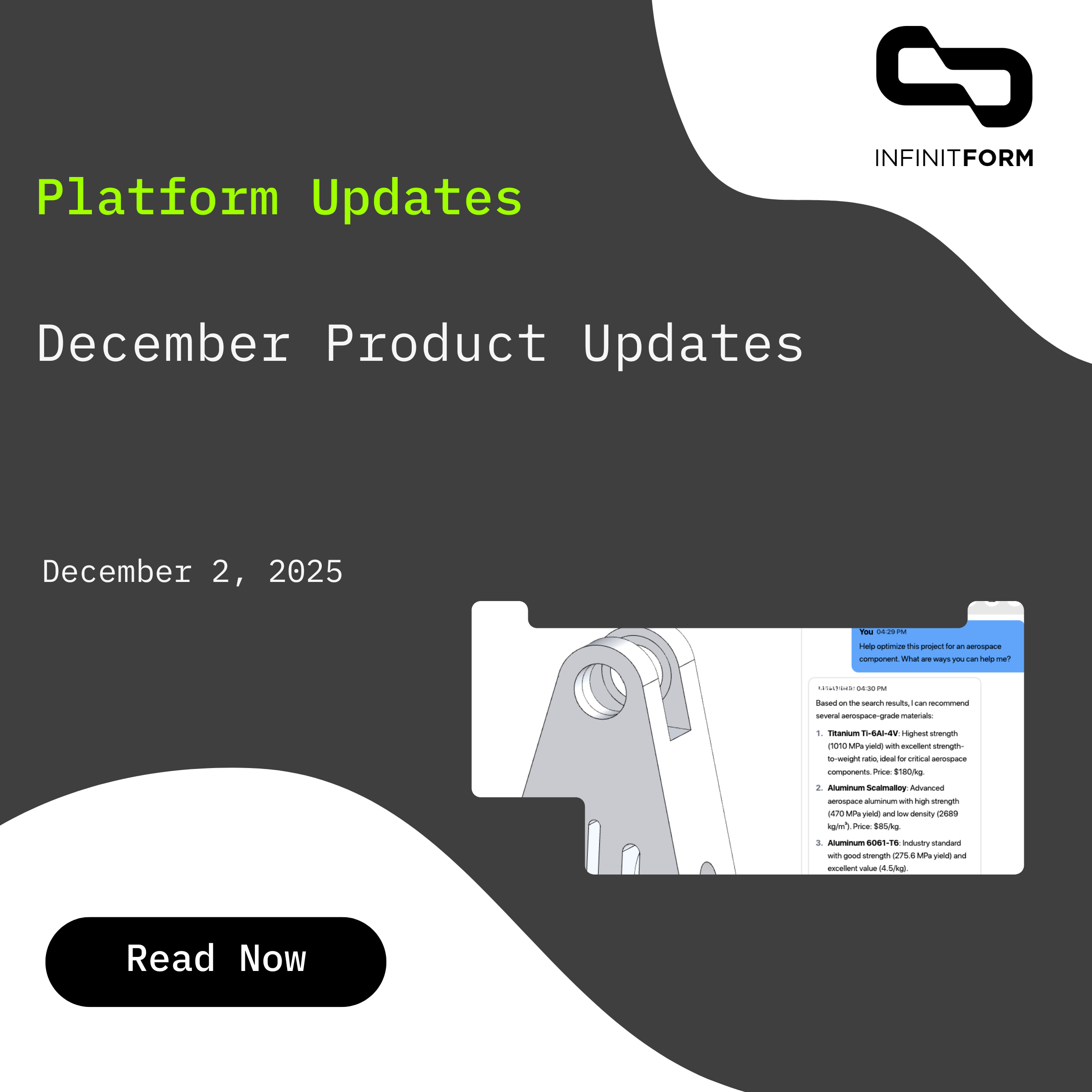 InfinitForm is dedicated to advancing artificial intelligence in manufacturing, with a focus on automating design for manufacturability (DFM) across traditional manufacturing processes—from CNC machining to die casting and injection molding. We're proud to announce several significant platform enhancements that reflect both our community's priorities and our vision for comprehensive DFM automation.